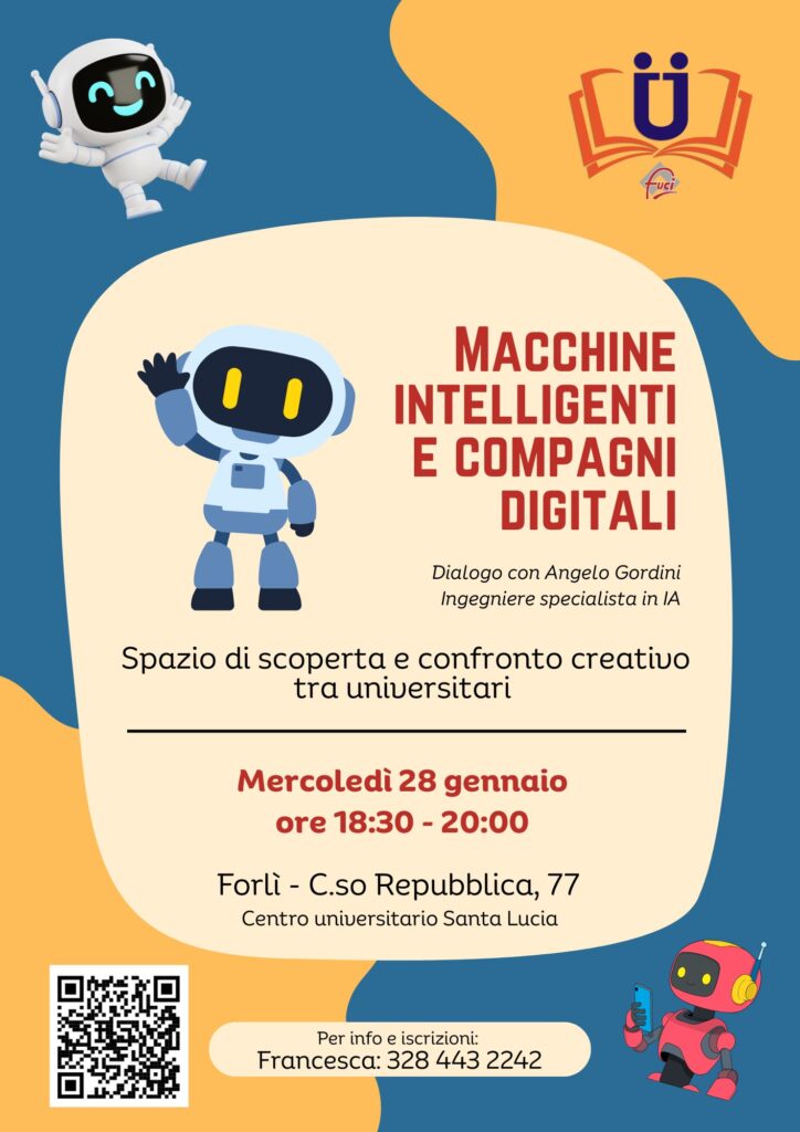 La serata sarà strutturata come dialogo con Angelo Gordini, che accompagnerà i partecipanti in una riflessione aperta e accessibile sul tema dell’intelligenza artificiale, delle macchine intelligenti e del loro impatto nella vita quotidiana, nello studio e nelle relazioni.